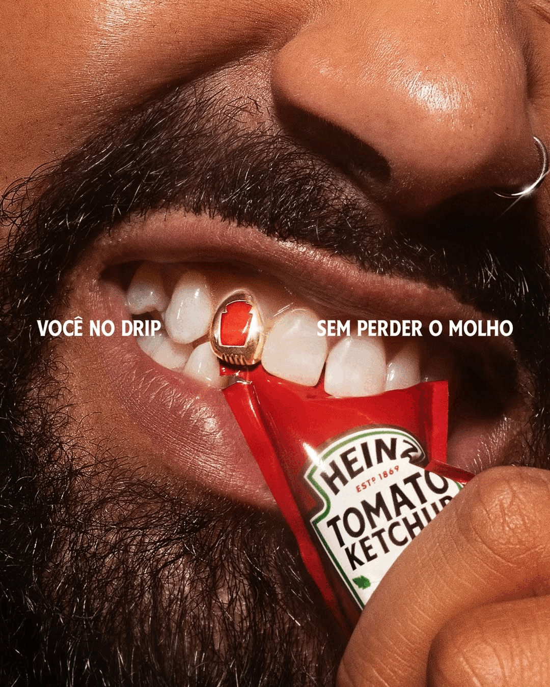 Key components of the campaign included a series of high-contrast, closeup photography featuring diverse models wearing custom-designed grillz that held different Heinz sauce packets (ketchup, mustard, and mayonnaise). Each visual was accompanied by the campaign tagline "You drippin' without losing the sauce".
